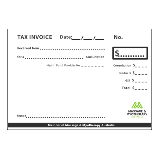 Official Massage & Myotherapy Australia Receipts with the association logo. The books are designed to accomodate a self-inking stamp to input your personal details.